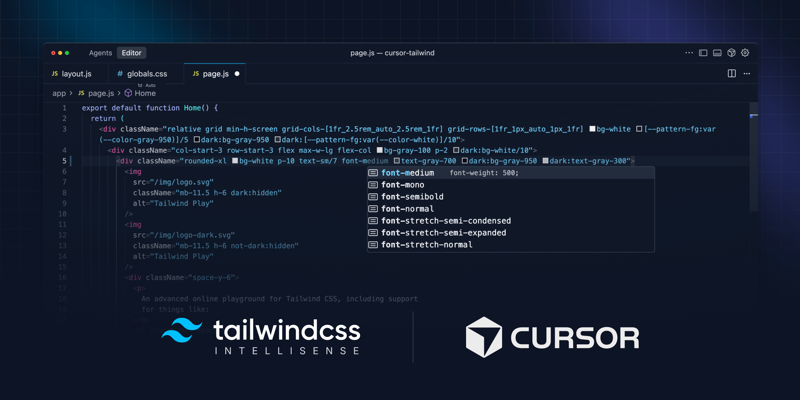 Cursor is an AI-native code editor with features like context-aware autocomplete and built-in coding agents. Since it supports VS Code extensions, all of the Tailwind CSS tooling you're already familiar with works out of the box – including our official Tailwind CSS IntelliSense extension and the Prettier plugin for class sorting.
